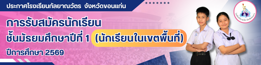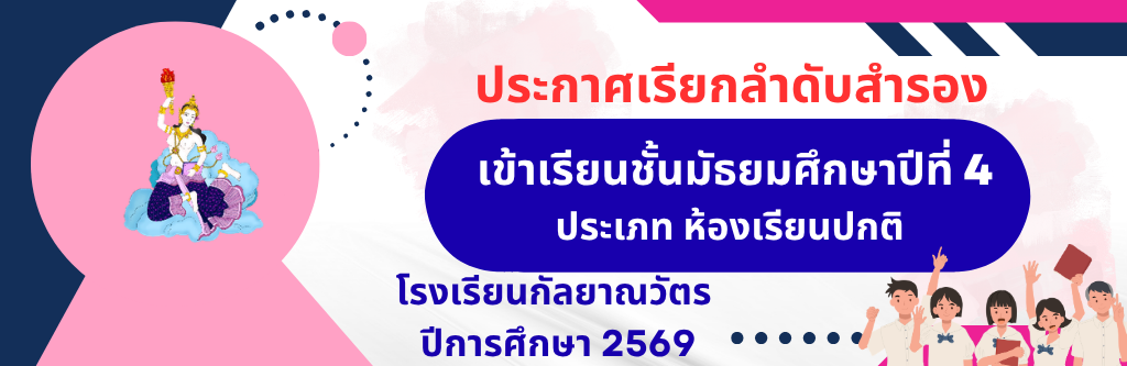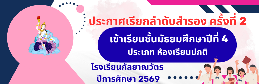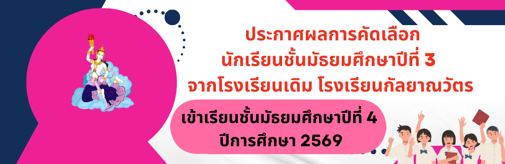 ประกาศโรงเรียนกัลยาณวัตร เรื่อง การมอบหมายให้ข้าราชการครูและบุคลากรทางการศึกษา โรงเรียนกัลยาณวัตร ปฏิบัติงาน ณ ที่พักอาศัย (Work from Home) เพื่อรองรับสถานการณ์วิกฤตการณ์ในตะวันออกกลาง อ่านต่อ » มีนาคม 23, 2026